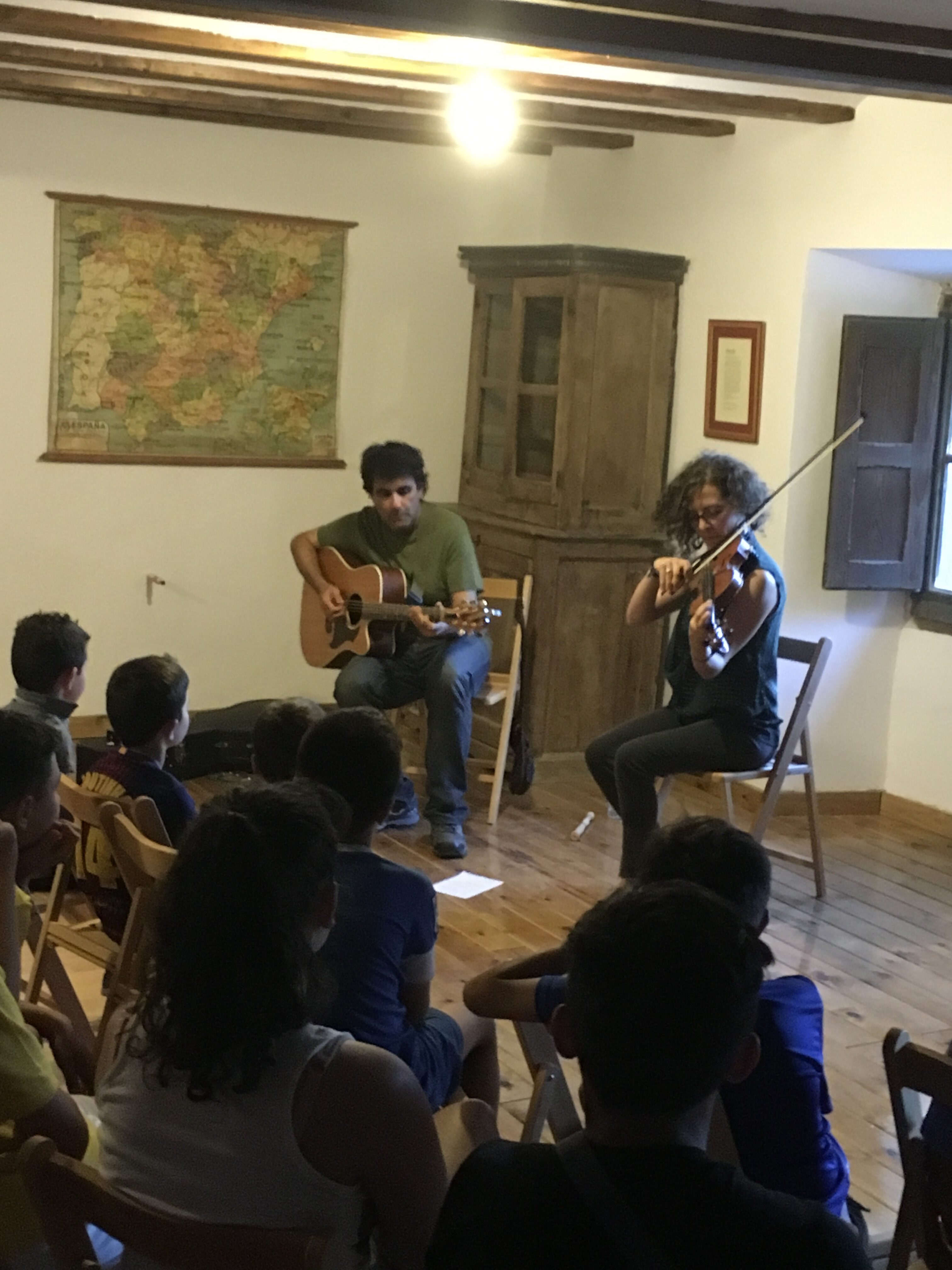 Blanca Altable con su violín y de Jesús con su guitarra en la Escuela Benaiges.