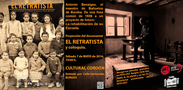 LA ASOCIACIÓN ESCUELA BENAIGES – BAÑUELOS DE BUREBA Y LA FETE-UGT BURGOS OS INVITAN:Kelly Santaellaabril 27, 2016Homenaje al maestro que prometió el mar «ANTONIO BENAIGES, DE UNA FOSA COMUN DE 1936 A UN PROYECTO DE VIDA, LA REHABILITACIÓN DE ... Leer mas...